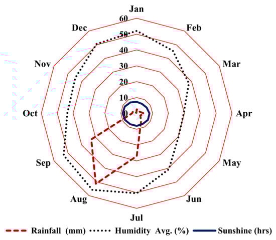 Monthly rainfall, humidity, and sunshine hours in the study area.