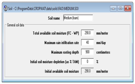 The major cultivable crops in the study area are wheat, cotton, sugarcane, and banana. The date of planting and harvesting of crops considered for the present study are described in Table 1. The soil in the study area is medium (loam) soil; the same soil is available in the software that was being employed for the present study, as portrayed in Figure 4.