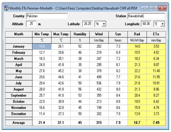 Data such as type of crop, date of cultivation, and soil type medium (loam) were entered into the CROPWAT and CLIMWAT software, including the country Pakistan and climatic station Shaheed Benazirabad. Once all the data were entered into the software, it calculated the irrigation water requirement and crop irrigation scheduling for major crops cultivated in the study area.