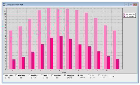 The reference evapotranspiration (ETo) for the major cultivated crops—wheat, cotton, sugarcane, and banana—in the district was calculated from the Penman–Monteith equation with the help of agro-climatic data. The reference evapotranspiration ranged from 3.53 mm/day to 11.95 mm/day. The maximum was in June and the minimum was in January, as shown in Figure 5. It was observed that ETo is high in summer due to the high temperature and decreases in winter due to the low temperature. Further, it was seen that increase in radiation value brings an increase in the ETo value, with the direct relation shown in Figure 6. The annual mean ETo was calculated as 7.49 mm. The low relative humidity, high temperatures, and high wind increased evapotranspiration during the dry season []. The differences in ETo values reflect the variation in weather parameters in the study area.
