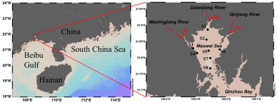 Geographical locations of the Maowei Sea and monitoring stations.