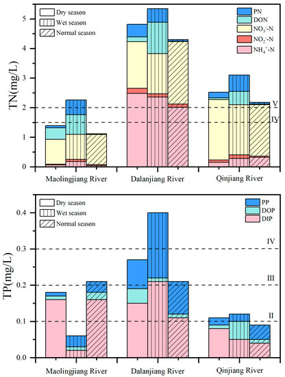 The results showed that the average TN concentration was 3.00 mg/L (Figure 2). The range was 1.12–3.35 mg/L; the highest was DLJR, and the lowest was MLJL, of which the TN concentration was the highest in the wet season of DLJR, which was 5.35 mg/L, and the lowest TN concentration in the normal season of MLJL was 1.12 mg/L. According to the Environmental Quality Standards for Surface Water in China [49], the water quality of MLJR in the wet season and the three seasons of DLJR and QJR was inferior to standard V (TN < 2 mg/L), the water quality in the wet season and normal season of MLJR was between standards III (TN < 1 mg/L) and IV (TN < 1.5 mg/L). The concentration levels of DIN and DON ranged from 0.93 to 4.23 mg/L and 0.01 to 1.06 mg/L, respectively, and DIN accounted for an average of 80.9% of TN, which was the main form of land-source TN. Among them, the main forms of DIN of MLJR and QJR were NO3−, accounting for an average of 86.8% and 84.4% of DIN of MLJL and QJR, respectively, while the main form of DIN of DLJR was NH4+, accounting for an average of 55.9% of its DIN. The average concentration of TP was 0.183 mg/L, ranging from 0.060 to 0.400 mg/L; the highest was DLJR, and the lowest was QJR, of which the TP concentration was the highest in the wet season of DLJR, which was 0.400 mg/L, and the lowest concentration of TP in the wet season of MLJL was 0.060 mg/L. The water quality of MLJR in the wet season and QJR in the normal season was better than standard II (TP < 0.1 mg/L), the water quality in the dry season of MLJR and the dry season and the wet season of QJR was between standards II and III (TP < 0.2 mg/L), the water quality of MLJL in the normal season and the dry season and the normal season of DLJR was between standards III and IV (TP < 0.3 mg/L), only the water quality in the wet season of DLJR was inferior to standard IV. In the land-source TP, the average concentration of PP was 0.056 mg/L, accounting for 30.3%. The average concentration of DOP was 0.019 mg/L, accounting for 10.3%. The average concentration of DIP was 0.109 mg/L, accounting for 59.4%, which was the main form of TP. In addition, the TN and TP concentrations of DLJR were higher in all seasons.
