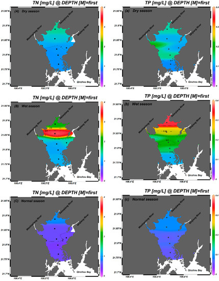 Spatiotemporal distributions of TN and TP in the Maowei Sea in dry, wet and normal seasons.