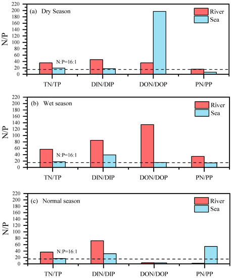 In 1963, Redfield proposed that the N/P ratio in plankton was nearly constant (N:P = 16:1) [50], and the Redfield ratio has since been widely used to determine whether the growth of phytoplankton in a certain area is N limited or P limited. The N/P ratio of the three rivers entering the sea was generally higher; the annual average of the TN/TP ratio was 43, the range was 12–54, the average DIN/DIP ratio was 68, the range was 13–121, the DON/DOP ratio was 58 on average, the range was 1–235, and the average PN/PP ratio was 18, and the range was 1–61. The overall performance of the estuarine area was phosphorus restriction (Figure 5), and the N/P ratio was higher than that in the dry season and the normal season, which was mainly due to the high nitrogen input concentration of the rivers entering the sea during the wet season. Compared to the rivers entering the sea, the N/P ratio of MWS was not high. The annual average of the TN/TP ratio was 18, ranging from 10 to 32, the average DIN/DIP ratio was 30, ranging from 10 to 62, the average DON/DOP ratio was 72, ranging from 0 to 308, and the average PN/PP ratio was 25, ranging from 2 to 252. The waters of the MWS and its estuarine area were generally relatively excessive in nitrogen and relatively insufficient in phosphorus, which may be one of the key reasons for the phosphorus limitation characteristics of MWS and its rivers entering the sea.