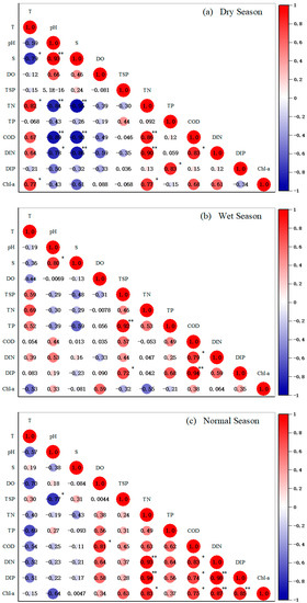 The correlation coefficients of the influencing factors showed that the TN and TP concentrations in the MWS exhibited significant changes in different seasons (Figure 6). There was a highly significant negative correlation between S and TN in the dry season (p < 0.01) but not in the wet and normal seasons. It indicated that the TN in the surface water of MWS was not only influenced by terrestrial input but may also be input from other sources [11]. S and TP were not significantly correlated in all three seasons. This suggested that TN and TP concentrations in MWS may be related to groundwater input, urban sewage, aquaculture wastewater input and freshwater discharge from the estuaries. In many cases, the flux of basement input nutrients was also greater than that from local rivers, such as in Sanggou Bay, China [51], eastern Laizhou Bay, China [52], and Maalaea and Kuau, USA [53]. DIN and DIP concentrations during the normal season were highly significantly positively correlated (Figure 6) and insignificantly correlated during the dry and wet seasons. This indicated that the main factors affecting the transport and transformation processes of nitrogen and phosphorus are not the same. During the wet and dry seasons, changes in precipitation and river flow, river leached on agricultural land, groundwater discharge, precipitation and other factors can affect DIN and DIP concentrations.
