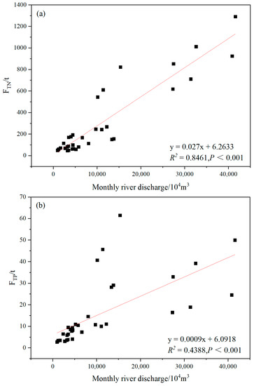 Seasonal variations of TN and TP fluxes in the estuarine of the Maowei Sea. (a) The relationship between TN flux and monthly river flow. (b) The relationship between TP flux and monthly river flow.