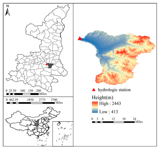 The study was conducted in the Bahe basin of China, which is in the northern part of the Qinling Mountains. The Ma Du Wang (MDW) hydrologic station was selected, located downstream in the Bahe basin; the watershed station before the Bahe River flows into the Weihe River. There is no large reservoir in the catchment. The catchment area is about 1760 (see Figure 1), the average elevation is 1170 m, and the land use is dominated by agriculture and forest. The average annual precipitation in the Bahe region is about 720 mm, and nearly 60% of precipitation occurs between July and October. Precipitation is the primary source of runoff, and the summer runoff accounts for more than 40% of annual runoff. According to the Köppen–Geiger climate classification, the watershed controlled by the MDW station belongs to Dwa and Dwb classes: monsoon-influenced hot/warm summer, semi-arid continental climate.