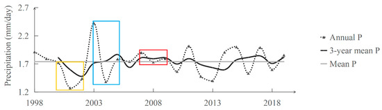 Figure 2 displays the precipitation information from 1998 to 2019 in the MDW station. It is easy to see that 2000–2002 is the only continuous period that every annual precipitation is lower than the average value; the annual precipitation is around 540 mm. To provide more valuable information for the application, as considered above, the period 2000–2002 is thus set as the validation period. Correspondingly, a relatively humid period is considered to be the calibration period. Through the plot, 2003–2005 shows the highest 3-year mean precipitation value (about 681 mm per year), making it as the calibration period. In order to increase the climatic robustness, the period 2007–2009 is also set as a calibration period, since its annual precipitation (about 661 mm per year) is higher than the average value in each year. In summary, two relatively humid periods (2003–2005 and 2007–2009) are applied for the calibration evaluation, and a relatively arid period (2000–2002) is used for the evaluation in this study.