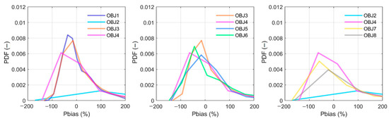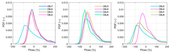 The probability density function (PDF) comparison for the objective functions evaluating by the percent bias (Pbias) during the calibration period 2007–2009.