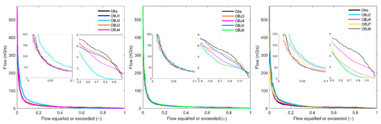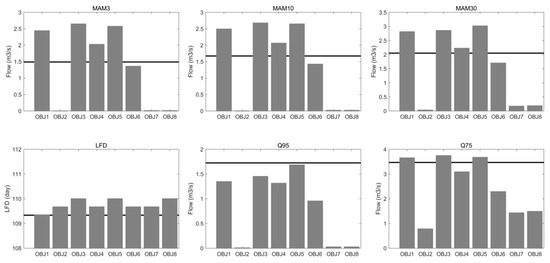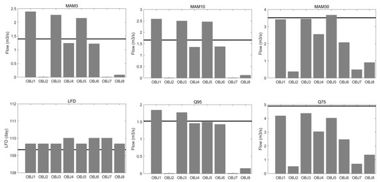 Through all subplots, the objective functions provide similarly good simulations to the observed LFD. Apart from the simulation of LFD, the objectives OBJ2, OBJ7, and OBJ8 vastly underestimate the other observed low flow indices, which are not comparable with other evaluated partners. Between the rest of the objectives, the inverse transformed objectives (OBJ4 and OBJ6) estimate the indices visibly lower than the logarithmic transformed ones (OBJ1, OBJ3, and OBJ5). For example, the average estimation for MAM3 is about 1.3 m3/s from the inverse transformed objectives, which is about 2.2 m3/s from the logarithmic transformed objectives.