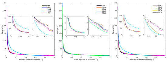 According to the left subplots, the simulated FDC from OBJ2 is far from all other curves, including the observation one. With the two zoomed subplots, OBJ2 presents substantial overestimation-to-observation for the highest 10% flow and heavy underestimation-to-observation for the lowest 50% flow. While the curves from OBJ1 and OBJ3 seem closer to the observation through two zoomed subplots, especially the low flow one. Compared with the left subplot, these multi objectives evaluated in the middle subplot produce more similar FDC simulations, especially for the high flows. While according to the zoomed low flow subplot, OBJ5 presents the closest FDC simulation to the observation, followed by OBJ3, and OBJ6 stays furthest. All simulated curves show a visible difference from the right subplot, more significant between each curve than from the left subplot. Among these objective functions, OBJ4 provides the closest simulation; the split objective functions work similarly to OBJ2.