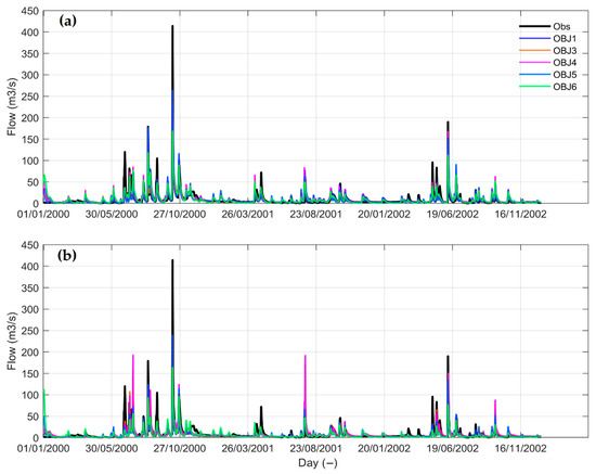 Figure 9 displays the observed and simulated hydrographs during the validation period, with the evaluated objectives, except for OBJ2, OBJ7, and OBJ8 due to the bad calibration.