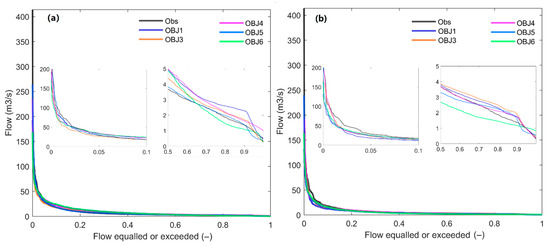 Overall, the simulated FDCs from all the objectives are comparable and not far from the observed FDC, consistent in both periods. Through the simulation for the highest 10% flow and the lowest 50% flow, the results of which are shown in the left and right zoomed subplots, respectively, the difference between objectives is large for the low flow simulations. Among the low flow simulation objectives, the FDC from OBJ5 seems closer to the observed curve in subplot (a), which changes to OBJ4 in subplot (b). In contrast, the simulated FDC from OBJ1 and OBJ6 in corresponding subplots (a) and (b) present a clear distance from the observation. In addition, the simulated FDCs tend to be higher than the observation in subplot (a), while they spread mixed on both sides of the observation in subplot (b).