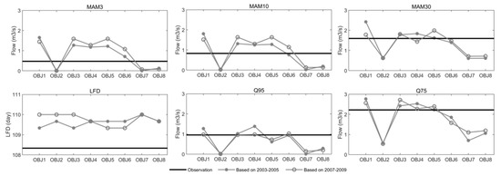 In Figure 8, the information is summarized similarly to Figure 7 but applies the data calibrated during 2007–2009. There are some of the same characteristics observed here as in Figure 7, such as the similar simulation from all objectives for LFD; unacceptable estimation by OBJ2, OBJ7, and OBJ8, and the higher estimation by logarithmic transformed objectives than the inverse transformed partners. However, the performance preference shows some differences here from Figure 7. First, OBJ6 produces a minor estimation error for the MAM3 and MAM10, while the OBJ5 yields almost the exact same estimation as the observed Q95. This result cannot support the finding in Figure 7 that the inverse transformed objectives produce a better estimation for the indices sensitive to the extreme low flows. Second, OBJ4 and OBJ5 provide the most similar estimation to the observed MAM30 and Q75, respectively. This result is not consistent with the finding that logarithmic transformed objectives provide a better estimation for the indices less sensitive to the extreme low flows.