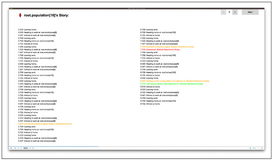 A screenshot of the storyteller agent documents the daily events and movements for a person agent over the course of a model run. Colored entries represent the events involving exposure to an illness or seeking treatment (orange), contracting the illness and experiencing symptoms (red), and recovering from the illness with or without professional treatment (green).