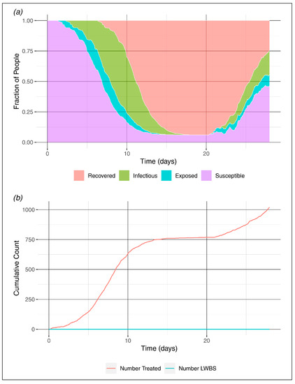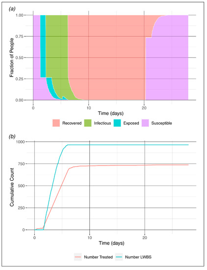 Results from contaminated truck scenario: (a) fraction of the population in susceptible, exposed, infectious, and recovered states; (b) cumulative count of people treated and leaving without being seen (LWBS) at the nursing station.
