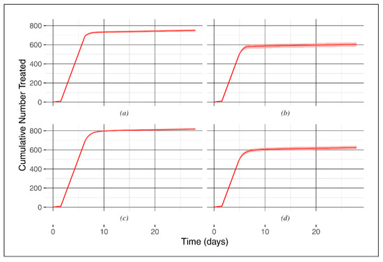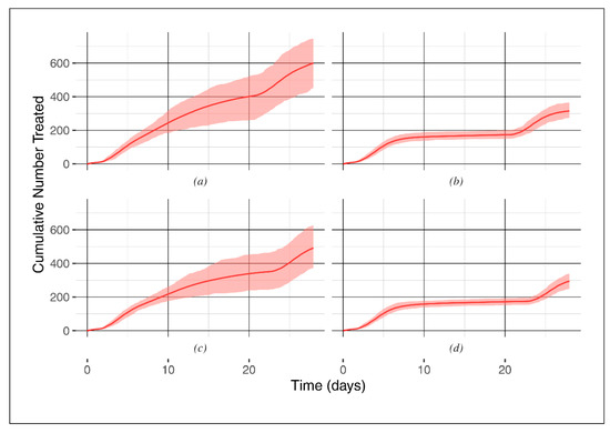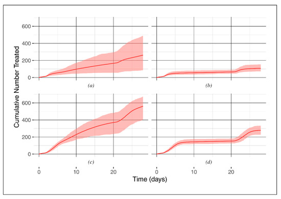 Patients treated from contaminated truck scenario: (a) 1-day cleaning interval with person-to-person transmission; (b) 1-day cleaning interval, no person-to-person transmission; (c) 5-day cleaning interval with person-to-person transmission; (d) 5-day cleaning interval, no person-to-person transmission. Bands represent the 5th to 95th percentile over 100 realizations.
