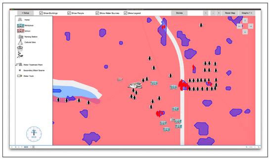 Homes, workplaces, a school, a nursing station (clinic), water treatment infrastructure, and cultural sites are represented in the model and assigned a geographic location on the community map. The model tracks person agents present at each place at any given time, and each place is associated with a water source. Total water use for each place is computed based on the number of people inside and the water use per person per day and influences how often the water truck visits the place. A place may be clean or contaminated with pathogens and may pose other generalized health hazards such as injury to the occupants. Each health hazard, including contamination by waterborne pathogens, carries with it a specified probability per six-hour period that a person in that place will be affected by the associated health condition.