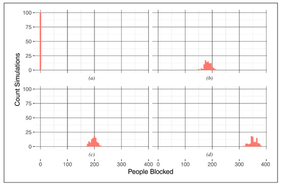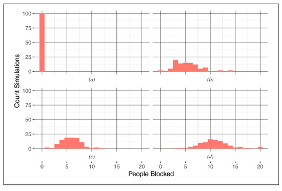 The model simulates the potential effects of various scenarios, designed to facilitate discussion and reasoning related to water security and health in engagement with the community. This work does not propose to provide predictive modeling for specific emergencies or real-time decision analytics, rather it provides a coarse-grained comparison of the extent of outcomes from certain plausible scenarios. Whereas some works [31,32] examine cooperative or adversarial interactions between multiple stakeholders, this work focuses on a single stakeholder group, the community of YQFN. Because water is delivered to some household cisterns by truck, the first scenario simulates the effects of microbial contamination of a water delivery truck on the spread of waterborne pathogens throughout the community. This scenario is also informed by research in other communities [8,33]. A second scenario simulates the spread of waterborne pathogens throughout the community if contaminated water were to be served at a Pow Wow (a major community event). Each of these scenarios tracks the number of people exposed to the pathogen, infectious with the pathogen, and seeking health care due to illness. The third scenario simulates the impact of flooding on preventing access to health care in the community due to ponding and road washouts commonly experienced in the community during heavy rainfall events. This scenario monitors the proportion of people experiencing impaired mobility within the community, and therefore impaired access to health care.