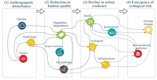 Anthropogenic disturbance (1) induced decline in habitat quality (2) leading to a reduction in ecosystem resilience (3) and an increase in ecological risks (4).