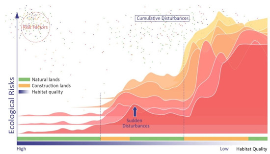 There is a certain negative correlation between habitat quality and ecological risks. As construction land increases for such things as roads, factories, houses, and so on, the habitat quality will decrease. At the same time, ecosystems will face greater and more frequent ecological risks, and the harm caused by anthropogenic disturbance will become more significant. According to the characteristics of ecological risk occurrence, they can be divided into an abrupt change of disturbances (sudden disturbance) and cumulative disturbances. Cumulative disturbances will bring more lasting and higher potential ecological risks, while sudden disturbances often produce great harm in a short time.