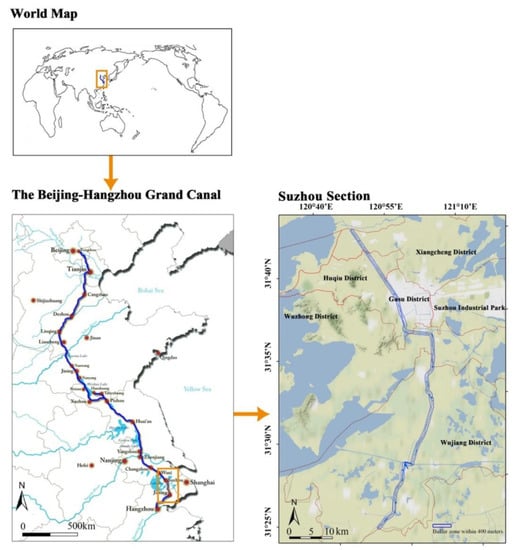 The study area is the buffer zone within 400 m of the Beijing-Hangzhou Grand Canal in the Suzhou Municipal District,120°44′E—121°00′E, 31°26′N—31°45’ N. The total length of the Beijing-Hangzhou Grand Canal in Suzhou is about 95 km (the old canal in the south of Taipu River is about 13km long), accounting for 40% of the canal in southern Jiangsu. The study area is flat, low-lying, and 3–5m above sea level; it has a subtropical monsoon oceanic climate, with an annual average temperature of 16–18°C and an annual precipitation of about 1000–1400 mm.
