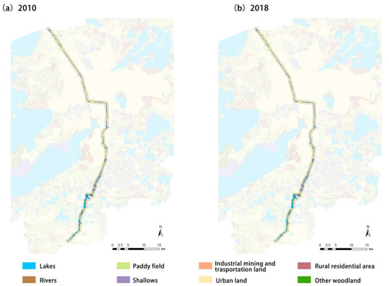 In this study, Landsat 8 remote sensing data of Suzhou in 2010 and 2018 were obtained from open data source LandsatLook (https://landsatlook.usgs.gov/explore. accessed on 18 December 2021). Mosaic registration correction and unsupervised classification with Envi was used for the present situation of LULC (the land use/land cover) in Suzhou city, with a spatial resolution of 30 m. Guidos Toolbox is used to convert the land use map into TIFF data for analysis. The spatial resolution of digital elevation model (DEM) data is 30m, which comes from geospatial data cloud (http://www.gscloud.cn/, accessed on 18 December 2021). According to the classification of LULC status (GB/T 21010-2017) and research purposes, the landscape types in the study area are divided into cultivated land (paddy fields and cropland), woodland (woodland, bush, open woodland, and other woodland), grassland (high-coverage grassland), wetland (rivers, lakes, shallows, beaches, and swamps), construction land (urban land rural residential area and industrial mining and transportation land), and bare land (bare land and barren land). Within a 400 m buffer zone of the Suzhou section of the Beijing-Hangzhou Grand Canal, there are eight land use types—lakes, rivers, paddy field, shallows, industrial mining and transportation land, urban land, rural residential area, and other woodland. Lakes refers to the land below the perennial water level in the naturally formed water accumulation area. Rivers refers to the land below the perennial water level of natural or artificially excavated rivers. Paddy field refers to the cultivated land with water source guarantee and irrigation facilities, which can be irrigated normally in ordinary years, and used for planting aquatic crops such as rice, including the cultivated land where rice and dry land crops are planted in rotation. Shallows refers to the water surface surrounded by the shoreline of the normal water storage level of the reservoir and the water surface of the shallows with a water storage capacity of less than 100,000 m³. Other woodland including open woodland, immature woodland, cut-over land, and nursery (see Figure 4).
