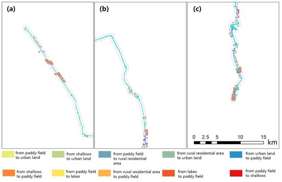 Changes of land use in the Suzhou section of the Grand Canal between 2010 and 2018. (a): Land type change in the upper reaches of the Grand Canal (Suzhou section), (b): Land type change in the middle reaches of the Grand Canal (Suzhou section), (c): Land type change in the downstream reaches of the Grand Canal (Suzhou section).