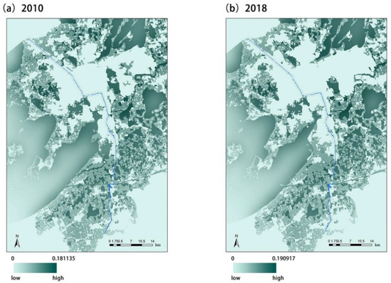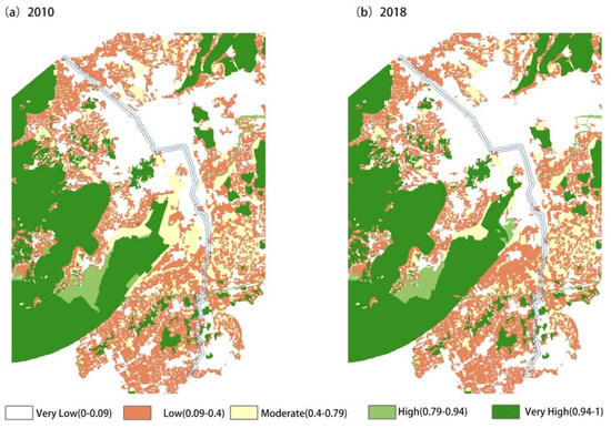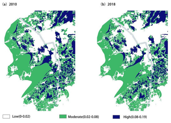 Based on the distribution of land use in Suzhou in 2010 and 2018, the Habitat Quality module analysis of the InVEST 3.9.0 model shows the changes in habitat quality, which is low in the middle and high on both sides. Through the natural breaks in ArcGIS, classification can be divided into the following five categories of Habitat Quality: Very Low (0–0.09), Low (0.09–0.4), Moderate (0.4–0.79), High (0.79–0.94), and Very High (0.94–1). As shown in Table 3, there is a trend of differentiation: there is an increasing change in the very low degree of habitat quality (urban land) and the very high degree of habitat quality (paddy fields, rivers, and lakes), and the other levels of habitat quality show a downward trend. Most of the habitat quality of the Suzhou section of the Grand Canal is in the moderate and low grades and shows a downward trend as the area of moderate habitat quality decreased by 7% and the area of low habitat quality decreased by 18.9%.