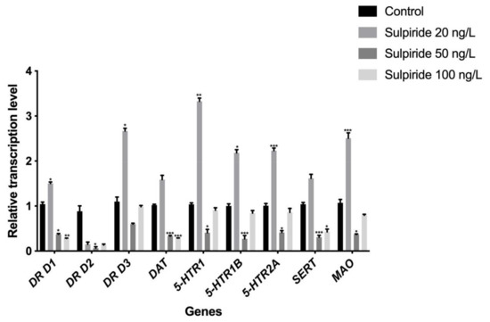 Sulpiride exposure for 14 days induced changes in gene transcription levels of functional molecules of DA and 5-HT neurotransmitter systems in octopus brain tissue. Note: * compared with the control group, p < 0.05; ** compared with the control group, p < 0.01; *** compared with the control group, p < 0.001; n = 5.