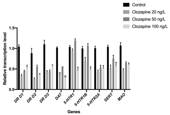 Clozapine exposure for 14 days induced changes in gene transcription levels of functional molecules of DA and 5-HT neurotransmitter system in octopus brain tissue. Note: * compared with the control group, p < 0.05; *** compared with the control group, p < 0.001; n = 5.