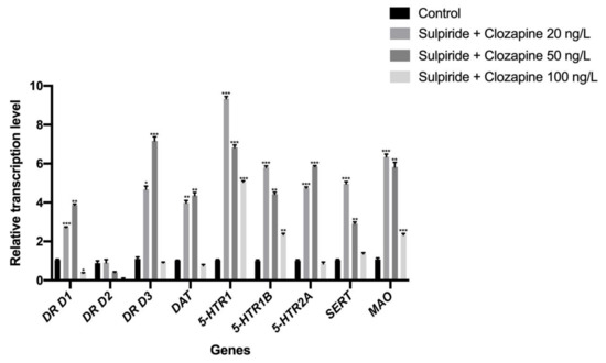 Sulpiride and clozapine induced the abnormal transcription of 5-HTR1, 5-HTR1B, 5-HTR2A, and SERT in octopus brain tissues after 14 days of continuous exposure (p < 0.0001). The expression levels of DRD1, 5-HTR1, 5-HTR1B, 5-HTR2A, SERT, and MAO were upregulated in the 20 ng/L mixed exposure group (p < 0.001); DRD3 and DAT were upregulated in the 20 ng/L mixed exposure group (p < 0.05). Furthermore, DRD1, DRD3, DAT, 5-HTR1, 5-HTR1B, 5-HTR2A, SERT, and MAO were upregulated (p < 0.01) and DRD2 was downregulated (p > 0.05) after 50 ng/L mixed exposure. The transcription levels of DRD1 (p < 0.05) were downregulated, but 5-HT1, 5-HT1B, and MAO (p < 0.01) were upregulated after 100 ng/L sulpiride and clozapine mixed exposure (Figure 3).