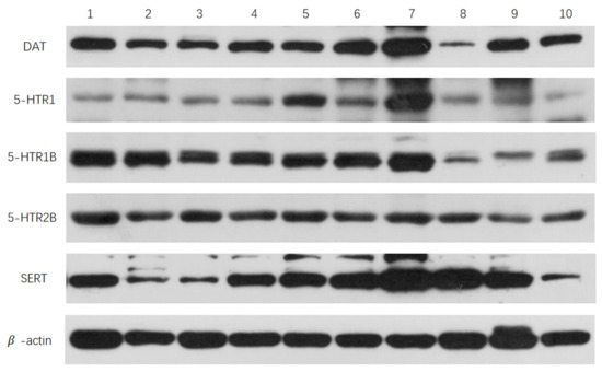 The whole brain was collected after anesthesia, and the vertical complex was extracted. Total protein was extracted using a commercial kit (Beyotime Institute of Biotechnology, Shanghai, China). A Western blot analysis was performed as previously described derivative [41]. Briefly, the tissue blocks were rinsed 2–3 times with pre-cooled phosphate buffered saline, and lysate (10 times the tissue volume) was added (the protease inhibitor was added within a few minutes before use), and a homogenization program was set up. After homogenization, the homogenate tube was placed on ice for 30 min and shaken every 5 min to ensure complete tissue disruption. Subsequently, the homogenate was centrifuged at 12,000 rpm for 10 min at 4 °C, and the supernatant was collected to form the total protein solution. Protein concentrations were determined using a BCA protein assay kit (Beyotime Institute of Biotechnology, Shanghai, China). Equal amounts of protein (30 μg) were separated on 10% or 12% sodium dodecyl sulfate-polyacrylamide gels and transferred to polyvinylidene difluoride membranes. The membrane was sealed with 1% bovine serum albumin for 1 h and then treated with rabbit anti-5HTR2B (dilution, 1:700; Solarbio Science & Technology, Beijing, China), rabbit anti-5HTR1B (dilution, 1:500; Thermo Fisher Scientific, MA, USA), rabbit anti-5HTR1 (dilution, 1:1000; Abcam Corporation, Cambridge, UK), rat anti-DAT (dilution, 1:500; Santa Corporation, Shanghai, China), rabbit anti-SERT (dilution, 1:1000; Abcam Corporation, Cambridge, UK), or mouse anti-rat β-actin (dilution, 1:500, ImmunoWay Biotechnology, Newark, DE, USA) overnight at 4 °C, and then incubated with alkaline phosphatase goat anti-rabbit IgG (dilution, 1:1000; ZSGB-BIO, Beijing, China) for 1 h. Western Blue® stabilized substrate alkaline phosphatase (Promega Corporation, Madison, WI, USA) was used to detect immune response signals, and then the membrane was air-dried and imaged using an image analyzer (Bio-Rad Laboratories, Inc., Hercules, CA, USA). The band intensities were tested using Image J v1.48 software (National Institutes of Health, MIH, Bethesda, USA). The Western blot analysis was repeated three times.
