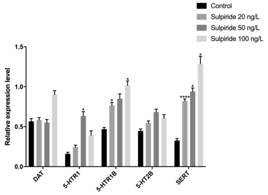 In addition, we also assessed the protein levels of DAT, 5-HTR1, 5-HTR1B, 5-HTR2B, and SERT. The results showed that 5-HTR1, 5-HTR1B, and SERT increased after sulpiride stimulation in octopus brain tissues (p < 0.0001), while no significant effect was seen for the concentration of 20 and 50 ng/L of sulpiride on protein levels of DAT and 5-HT2B compared with the control group. The expressions of 5-HT1B and SERT were upregulated in the 20 ng/L sulpiride group (p > 0.05). The protein expression of 5-HTR1 and SERT was significantly induced by 50 ng/L sulpiride exposure compared with the control (p < 0.05). Furthermore, 5-HTR1B and SERT expressions were increased significantly in the 100 ng/L sulpiride exposure group (p < 0.05) (Figure 5).