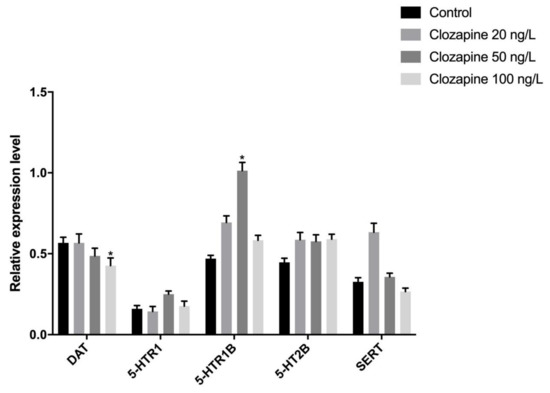 DAT, 5-HTR1, 5-HTR1B, 5-HTR2B, and SERT expression levels were abnormal in the octopus brain tissues after 14 days of clozapine exposure (p < 0.05). The expressions of DAT, 5-HTR1B, 5-HTR2B, and SERT were upregulated in the 20 ng/L clozapine exposure group (p > 0.05). The expressions of 5-HTR1, 5-HTR2B, and SERT were upregulated (p > 0.05) and the expression of 5-HTR1B was upregulated (p < 0.05) in the 50 ng/L group. DAT expression was decrease significantly (p < 0.05) after the 100 ng/L treatment (Figure 6).