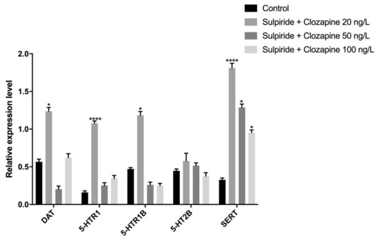Sulpiride and clozapine mixed exposure for 14 days induced changes in protein expression levels of functional molecules of DA and 5-HT neurotransmitter systems in octopus brain tissue. Note: * compared with the control group, p < 0.05; **** compared with the control group, p < 0.0001; n = 5.