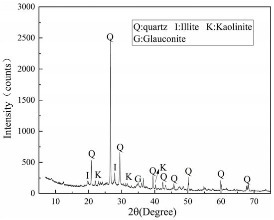 The sludge used in this study was taken from the bottom of a river in Wuhan, China. The basic physical properties of sludge were determined according to the relevant standards [14,15,16,17], and the results are shown in Table 1. According to the Unified Soil Classification System (USCS), the sludge was classified as low-liquid-limit clay (CL). According to the X-ray diffraction (XRD) test (Figure 1), the sludge was mainly composed of quartz, kaolinite, illite and montmorillonite. The sludge was pretreated with hydrogen peroxide to avoid the interference of natural organic matter inside the sludge. Then, the sludge was thoroughly dried at 60 °C and finally mechanically broken into powder for reserve.