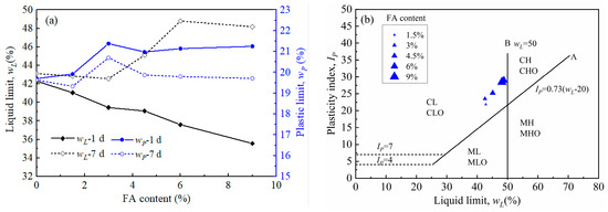Effect of FA on the consistency limit of sludge: (a) liquid limit and plastic limit; (b) plasticity diagram.