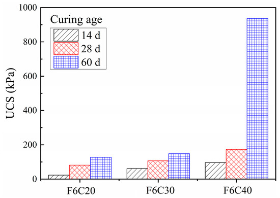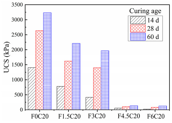 When the cement content is fixed at 20%, the influence of FA content on the strength of CDS is shown in Figure 4. The strength of F0C20 was 1410, 2630 and 3230 kPa for 14, 28, and 60 days, respectively, while the 28-day strength of F1.5C20 decreased to 1620 kPa. When the FA content increased to 4.5% (F4.5C20), the CDS showed almost no strength performance after curing for 14 days, and its 28-day strength was still less than 1000 kPa. Therefore, the strength of CDS decreased significantly with the FA content, indicating that FA has a significant weakening effect on the strength development of CDS.