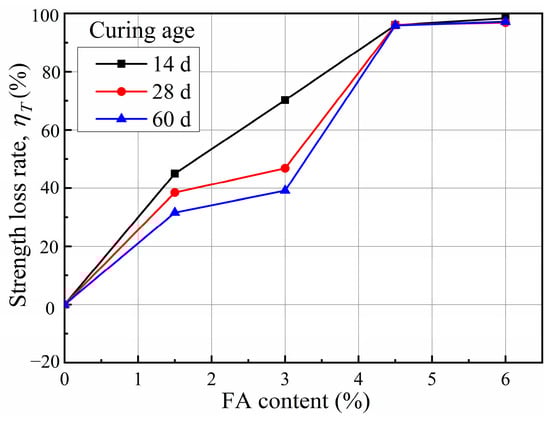 where ηT is the strength loss rate; S0 is the strength of CDS with 0% FA; Sx is the strength of CDS containing x% FA. The larger is the ηT, the greater is the negative effect of FA on the strength. As can be seen in Figure 5, the ηT decreased with the increase in FA content, and the ηT of CDS cured for 14, 28 and 60 days were all greater than 95% when the FA content reached 4.5%. Therefore, the detrimental effect of FA on the strength is very significant, especially in the early curing stage. For instance, the ηT of F3C20 cured for 14, 28 and 60 days were 70.3, 46.9 and 39.2%, respectively. It can be inferred that the deterioration effect of FA on the strength gradually decreased with curing age.