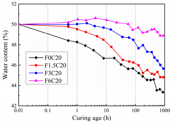 Cement react with liquid pore water in the sludge to form hydrates such as ettringite (AFt), calcium aluminate hydrate (CAH) and calcium silicate hydrate (CSH). Additionally, part of pore water can be converted into combined water as a component of the hydrates with curing age, resulting in the decrease in water content of CDS, as shown in Table 4. Therefore, the water content evolution of CDS can reflect the hydration progress of cement and further evaluate the solidification effect. Figure 7 showed the water content of CDS with curing age when the cement content is 20%. The water content of CDS (the initial value was 50%) with different FA content gradually decreased with the curing age. For instance, the water content of F0C20 decreased almost linearly within 0.5 to 250 h after cement is added. However, with the increase in FA content, the decline rate of water content in CDS decreased significantly. Furthermore, the water content of F1.5C20, F3C20 and F6C20 began to decrease significantly after curing for 0.5, 2.2 and 4.3 h, respectively, indicating that FA can delay the hydration reaction of cement. In particular, the water content of F6C20 only decreased to 48.98% after curing for 28 days, which proved that the hydration reaction of cement was severely inhibited.