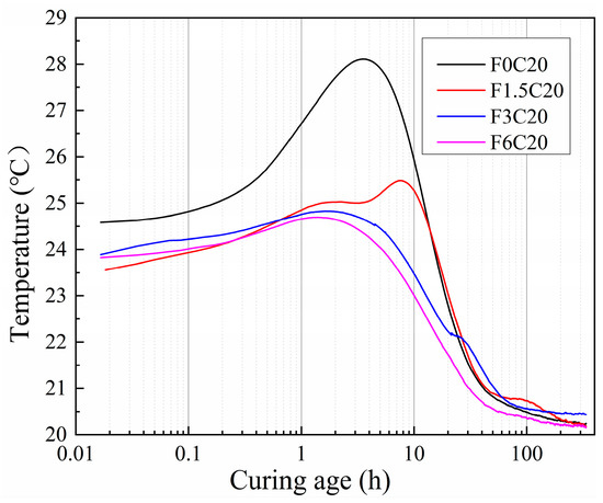 The heat released during the hydration reaction of cement can lead to the rise of the temperature in CDS. In this test, the temperature change of CDS with different FA content is shown in Figure 8. Since this experiment was conducted at room temperature, the initial temperature of CDS samples fluctuated slightly in the range of 23.3~25 °C. The temperature of CDS with different FA content increased first and then decreased with curing age. For example, the initial temperature of F0C20 is 24.53 °C, and its internal temperature increased to the maximum value of 28.11 °C after curing for 3.6 h. Then, the temperature gradually decreased to nearly 20 °C after curing for 100 h. Compared with F0C20, the temperature peak of CDS containing FA decreased significantly, indicating that the FA significantly delayed cement hydration.