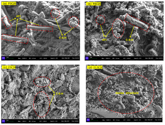 SEM images of CDS with different FA content cured for 28 days: (a) F0C20, (b) F6C20, (c) F3C20, and (d) F1.5C20.