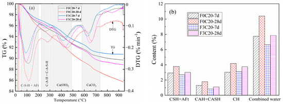TGA results of F0C20 and F3C20: (a) TG and DTG curves; (b) the amount of hydrates.