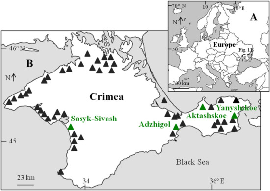 On the Crimean Peninsula, there are many hypersaline water bodies (Figure 1), which differ in size, ranges of salinity fluctuations, and biological diversity [35,36].