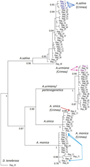 Ten Artemia haplotypes were found in Crimea and 77 haplotypes globally [6,38,39,40]. Among the 10 haplotypes found in Crimea, 6 were found for the first time: One for A. monica, one for A. sinica, and four for A. salina. Those haplotypes may be regarded as endemic to Crimea. This fact may also be explained in two ways: First, the introduction of A. monica and A. sinica occurred before the 1990s, or second, those species evolved quickly in Crimea as was shown for other regions [19].