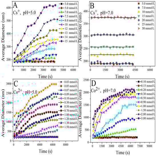The relationship between the hydrodynamic diameter of HA and the aggregation time under different concentrations of Cs+ and Co2+ metal ions at pH 5.0 and 7.0 are presented in Figure 1. At low metal ion concentrations (Cs+: pH 5.0, 3.0 and 5.0 mmol/L; Co2+: pH 5.0, 0.03, 0.05 and 0.07 mmol/L; Co2+: pH 7.0, 0.10 and 0.15 mmol/L), no obvious HA aggregation can be observed due to the addition of metal ions in the solution, and the hydrodynamic diameter maintains a constant value of 180 nm. The addition of low concentrations of metal ions in the HA solution has negligible effects on the stability of the HA aggregates. However, as the metal ion concentration further increased, the hydrodynamic diameter of HA aggregates gradually increased with the aggregation time after adding metal ions in the HA solution, except Cs+ at pH 7.0. Taking the Cs+ metal ion (Figure 1A, pH 5.0) as an example, when the concentration of the Cs+ was 7.0 and 7.5 mmol/L, the hydrodynamic diameter of the HA aggregates began to increase slowly at the aggregation time of 2000 s, and finally reached a maximum of 210 and 240 nm, respectively, over enough time (4500 s). However, once the Cs+ concentration exceeded a certain value of 8.0 mmol/L, the hydrodynamic diameter of the HA aggregates changed significantly, increasing sharply from 238 to 620 nm with increasing Cs+ concentration. Moreover, at pH 7.0 (Figure 1B), with the increase in Cs+ concentration, the hydrodynamic diameter of the HA aggregates also increased obviously at given Cs+ concentrations; however, the hydrodynamic diameter kept a constant value (5.0 mmol/L, 187 nm; 7.0 mmol/L, 189 nm; 10 mmol/L, 224 nm; 15 mmol/L, 258 nm; 20 mmol/L, 305 nm; 25 mmol/L, 375 nm and 30 mmol/L, 375 nm) through the whole aggregation time, and no obvious increasing trend can be observed during the whole aggregation process.