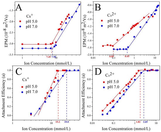 To determine the effects of solution pH and metal ion concentrations on the electrokinetic properties of HA aggregates, the EPM of HA was studied, and the results are shown in Figure 2A,B. The experimental results indicated that the HA aggregates were negatively charged over the entire metal ion concentration range studied, and solution pH had a great influence on the electrokinetic properties of the HA aggregates. At pH 5.0, the EPM of the HA aggregates was negative (Cs+: −3.02 × 10−8 to −1.69 × 10−8 m2/Vs; Co2+: −1.74 × 10−8 to −0.92 × 10−8 m2/Vs), and became more negative (Cs+:−3.21 × 10−8 to −1.23 × 10−8 m2/Vs; Co2+:−1.84 × 10−8 to −0.61 × 10−8 m2/Vs) as the pH was increased to 7.0 over a wide range of Cs+ and Co2+ concentrations; this confirmed the presence of numerous functional groups in the HA structure and the strong dependence of EPM on solution pH []. Additionally, one can also find that with increasing metal ion concentrations, the EPM of HA aggregates also became less negative due to an increase in charge−screening or charge−neutralization effects [].
