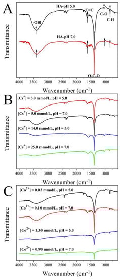 FT−IR spectra of HA before (A) and after (B,C) interaction with Cs+ or Co2+ metal ion after long aggregation time at pH 5.0 and 7.0.