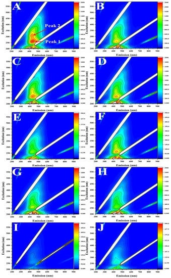 Fluorescence EEM spectra were measured using the spectrofluorometer Hitachi F-7000 FL (Tokyo, Japan) with a 1 × 1 quartz cuvette. The scanning excitation (EX) and emission (EM) were gathered from 300 to 500 nm and from 250 to 450 nm at 5 nm increments, respectively. The spectra were recorded at a scan rate of 1200 nm min−1 using EM and EX slit bandwidths of 5 nm [].